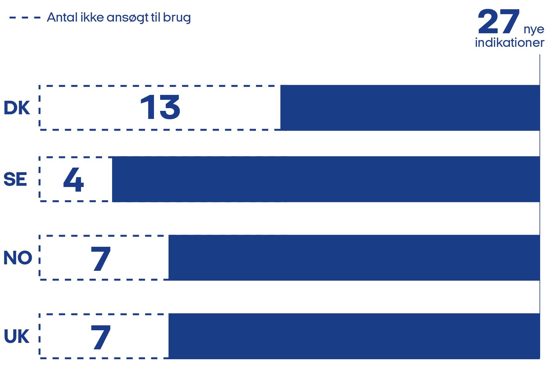 I Danmark er der 13 indikationer, som ikke er blevet ansøgt om vurdering af Medicinrådet, mens det tal er lavere med 4 indikationer i Sverige, 4 i Norge og 7 i England. Danmark har anbefalet 7 indikationer, mens Sverige har anbefalet 8, Norge 9 og England 15 indikationer.