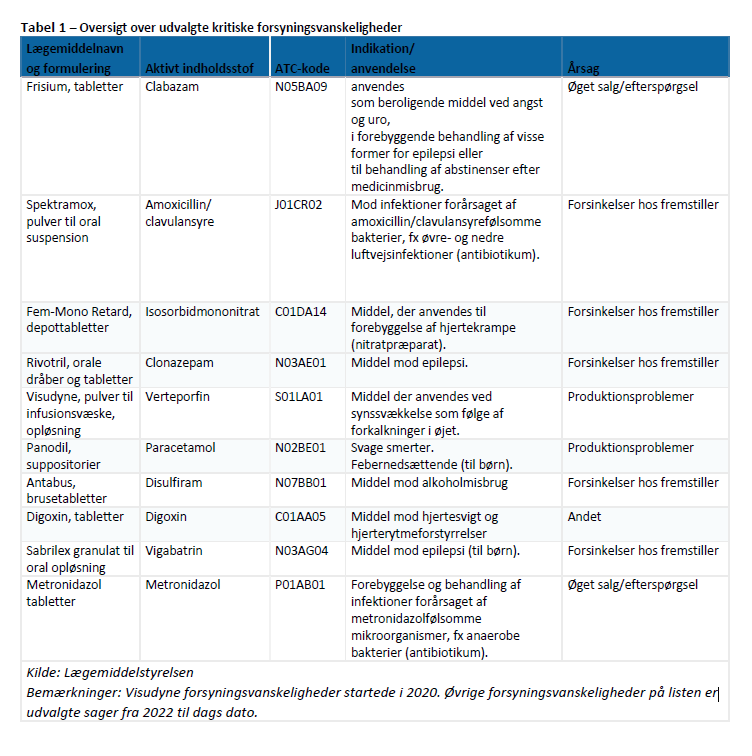 Lægemiddelstyrelsen kan opgøre sager om kritiske forsyningsvanskeligheder fra 31. marts 2020. Det er ikke muligt at gå længere tilbage. Lægemiddelstyrelsen har til besvarelse af spørgsmålet udarbejdet en tabel (tabel 1) over udvalgte kritiske forsyningsvanskeligheder for perioden 31. marts 2020 til dags dato. Tabel 1 fremgår nedenfor og indeholder lægemiddelnavn og form, aktive indholdsstof, ATC-kode, indikation/anvendelse af lægemidlet samt overordnet årsag til virksomhedens forsyningsvanskelighed. Det skal bemærkes, at ”kritisk” er defineret som situationer, hvor det ikke er muligt at finde et andet lægemiddel til behandling af patienten, og hvor en mangel kan have potentielt livstruende eller alvorlige sundhedsskadelige konsekvenser for patienten. Er lægemidlet tilgængeligt i en anden pakningsstørrelse eller findes der et markedsført, substituerbart lægemiddel, vil der ikke være tale om en kritisk forsyningsvanskelighed. Det samme gør sig gældende i situationer, hvor patienten kan skiftes over på et andet, ikke-substituerbart lægemiddel, for eksempel et lægemiddel på udleveringstilladelse eller et alternativt markedsført lægemiddel via ny recept fra lægen. Vurderingen af kritikalitet kan ændre sig undervejs i Lægemiddelstyrelsens sagsbehandling, for eksempel, hvis en anden virksomhed, som har samme/tilsvarende lægemiddel markedsført, kan levere mere end normalt af det i mangelperioden. Det indebærer, at en forsyningsvanskelighed, der indledningsvis er vurderet kritisk, ikke nødvendigvis ender med i en situation, der påvirker patientbehandlingen i kritisk grad. Håndtering af forsyningsproblemer koster megen tid og ressourcer hos myndighederne og i sundhedsvæsenet, men heldigvis resulterer håndteringen i, at vi sjældent oplever at en forsyningsvanskelighed betyder, at patienter står helt uden mulighed for medicinsk behandling. Det bemærkes, at grundlaget for, hvad der skal indberettes som forsyningsvanskeligheder til Lægemiddelstyrelsen siden juni 2023, har været Lægemiddelstyrelsens liste over kritiske lægemidler.