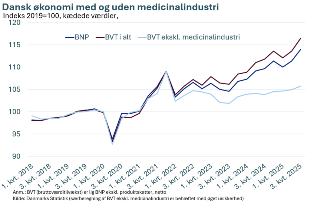 Medicinalindustrien fortsætter med at have stor betydning for dansk økonomi, der vokser i tredje kvartal af 2025.