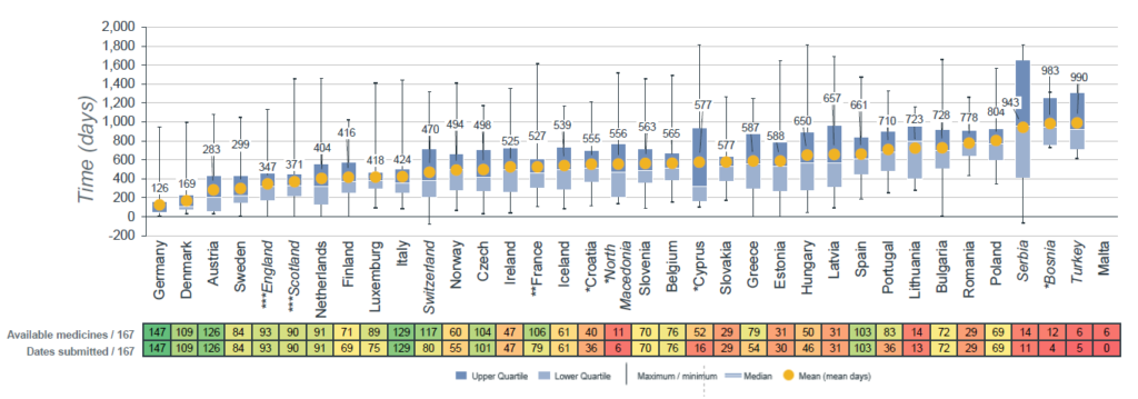 EFPIAs rapport måler derudover tiden mellem den europæiske markedsføringstilladelse og tilgængelighed i de forskellige lande. I Danmark er datoen for tilgængelighed er målt ved datoen, hvor et lægemiddel optræder med en pris på Lægemiddelstyrelsen liste over medicinpriser for første gang. Tiden til tilgængelighed er derfor målt ved antallet af dage mellem den europæiske markedsføringstilladelse og den første forekomst på listen over medicinpriser. I gennemsnit er der gået 169 dage fra markedsføringstilladelse til den første dato, hvor de nye lægemidler er tilgængelige i Danmark.